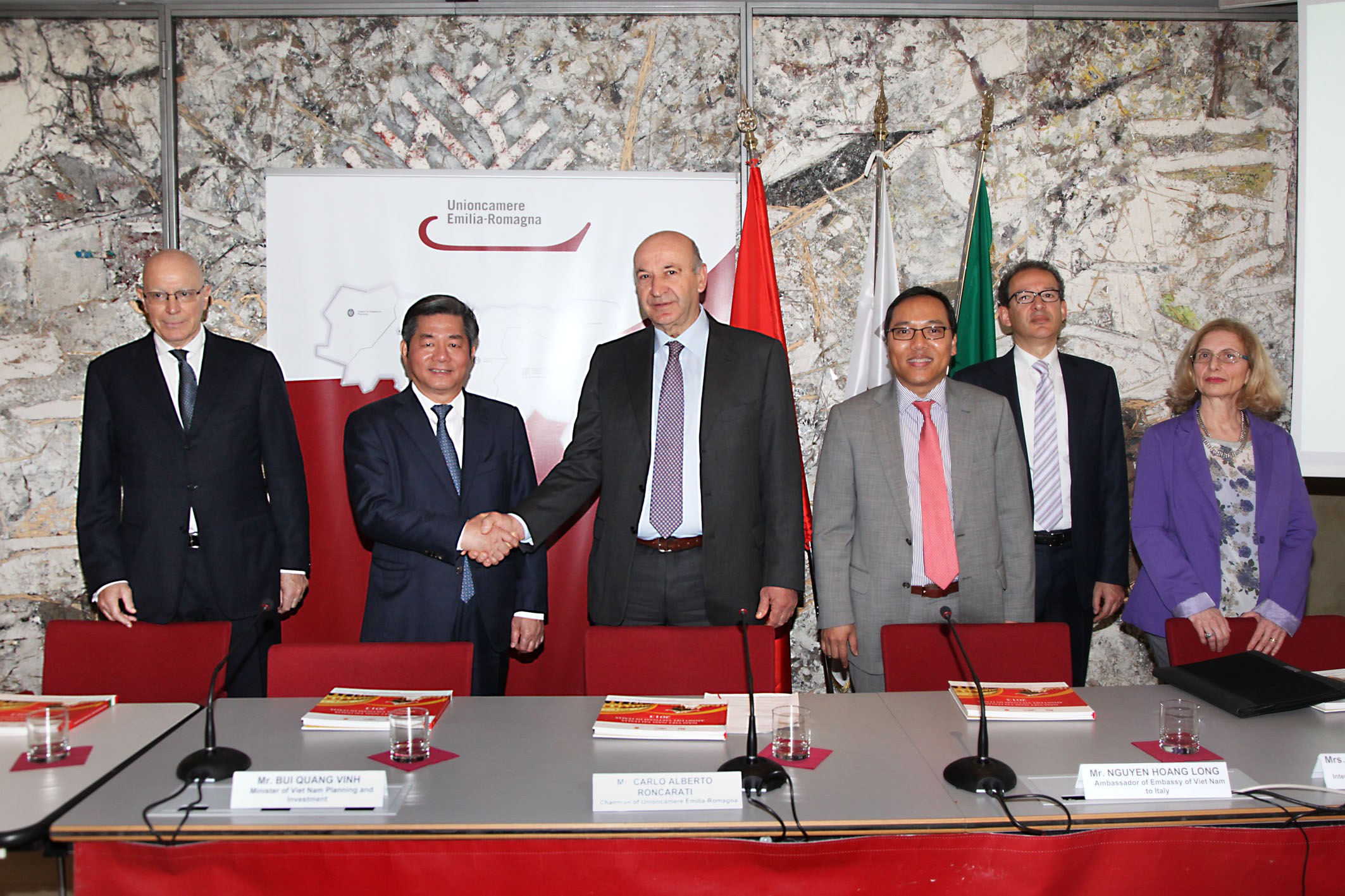 Da sinistra: U. Girardi, Segr. Gen. Unioncamere ER - B. Quang Vinh, Ministro Pianificazione Rep. Vietnam - C. A. Roncarati, Pres Unioncamere ER - H. L. Nguyen, Amb. Rep. Vietnam - N. Lener, Min. Affari Esteri - P. Giarratana, Vice Dir. DG Min. Svil. Ec.