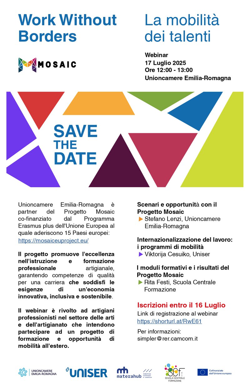Unioncamere Emilia-Romagna è partner del progetto Mosaic co-finanziato dal Programma Erasmus plus dell'Unione Europea al quale aderiscono 15 Paesi europei: https://mosaiceuproject.eu/