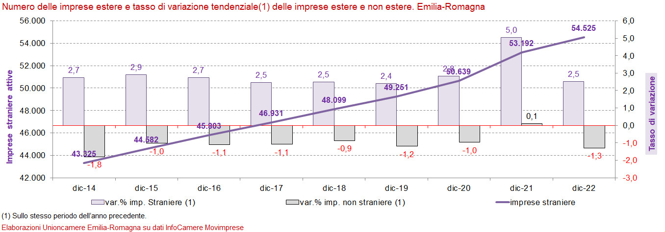 Al termine del 2022 in Italia le imprese di stranieri sono risultate in leggera crescita (+0,6 per cento), mentre le altre imprese hanno confermato la loro tendenza negativa con un ulteriore accelerazione della flessione (-0,8 per cento) apparsa più rapida di quella regionale.