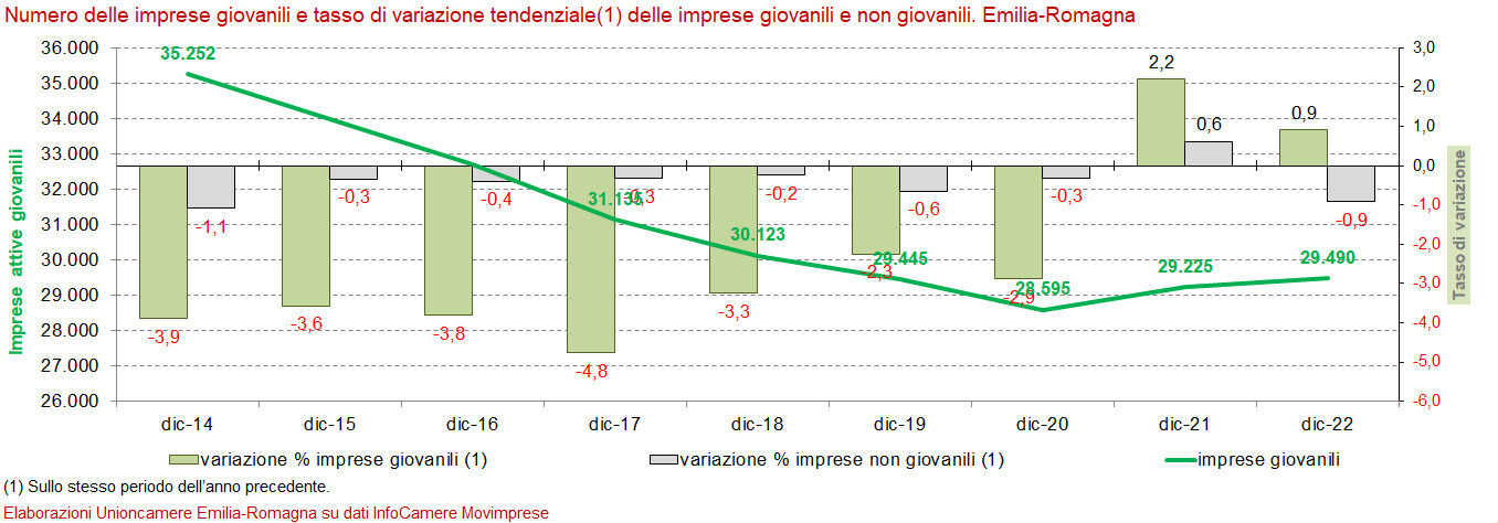 Alla fine del 2022 le imprese attive giovanili emiliano-romagnole sono salite a quota 29.490. È proseguita più contenuta la tendenza positiva avviata con il primo trimestre del 2021 e che ha fatto registrare negli ultimi tre mesi dello scorso per anno un incremento di 265 unità (+0,9 per cento) rispetto alla fine del 2021, grazie alle costruzioni e ai servizi diversi dal commercio. Al contrario la tendenza si è confermata negativa per le imprese regionali non giovanili (-0,9 per cento, -3.422 unità). È quanto risulta dai dati del Registro delle imprese delle Camere di commercio elaborati da Unioncamere Emilia-Romagna.