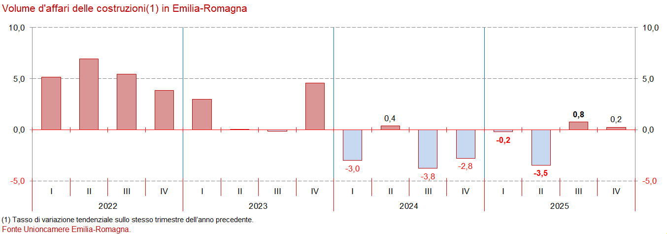 Contenuta la spinta dei “super bonus”, che comunque avevano permesso di chiudere il 2023 in positivo, dall’inverno 2024, l’andamento dell’attività dell’industria delle costruzioni emiliano-romagnola è divenuto chiaramente negativo, ma, ha invertito la tendenza in positivo la scorsa estate e tra ottobre e dicembre dello scorso anno il volume d’affari a prezzi correnti delle costruzioni ha messo a segno un nuovo, anche se lieve, incremento (+0,2 per cento) rispetto allo stesso periodo del 2024, nuovamente favorito anche dal confronto con quello che era stato un trimestre difficile.